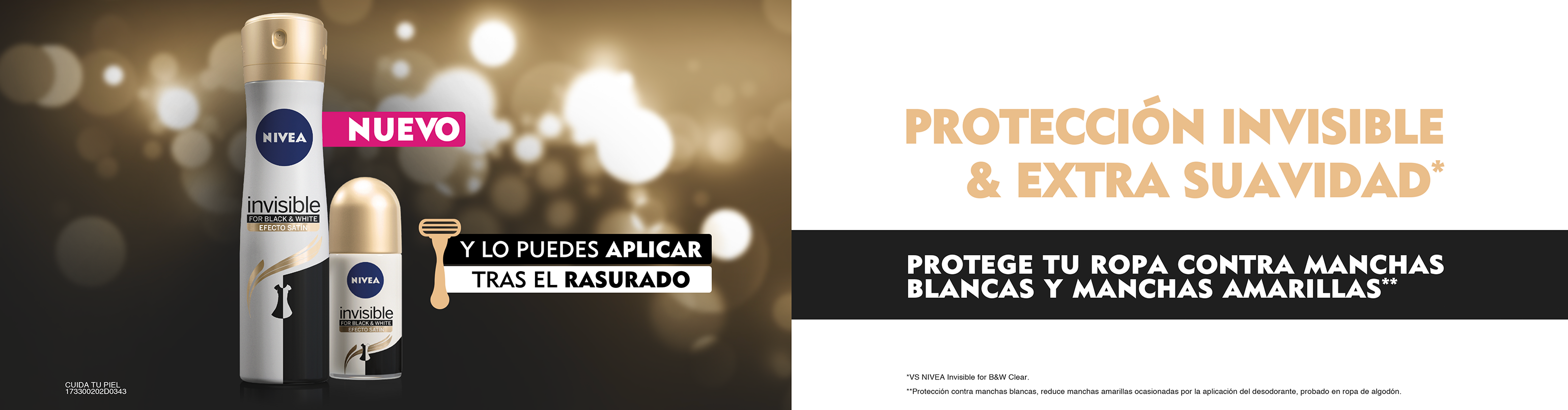 El antitranspirante NIVEA INVISIBLE FOR BLACK & WHITE EFECTO SATÍN cuenta con la protección patentada contra manchas de NIVEA: el negro permanece negro, el blanco permanece blanco por más tiempo, además de ingredientes que permiten usarlo incluso después de rasurarte.